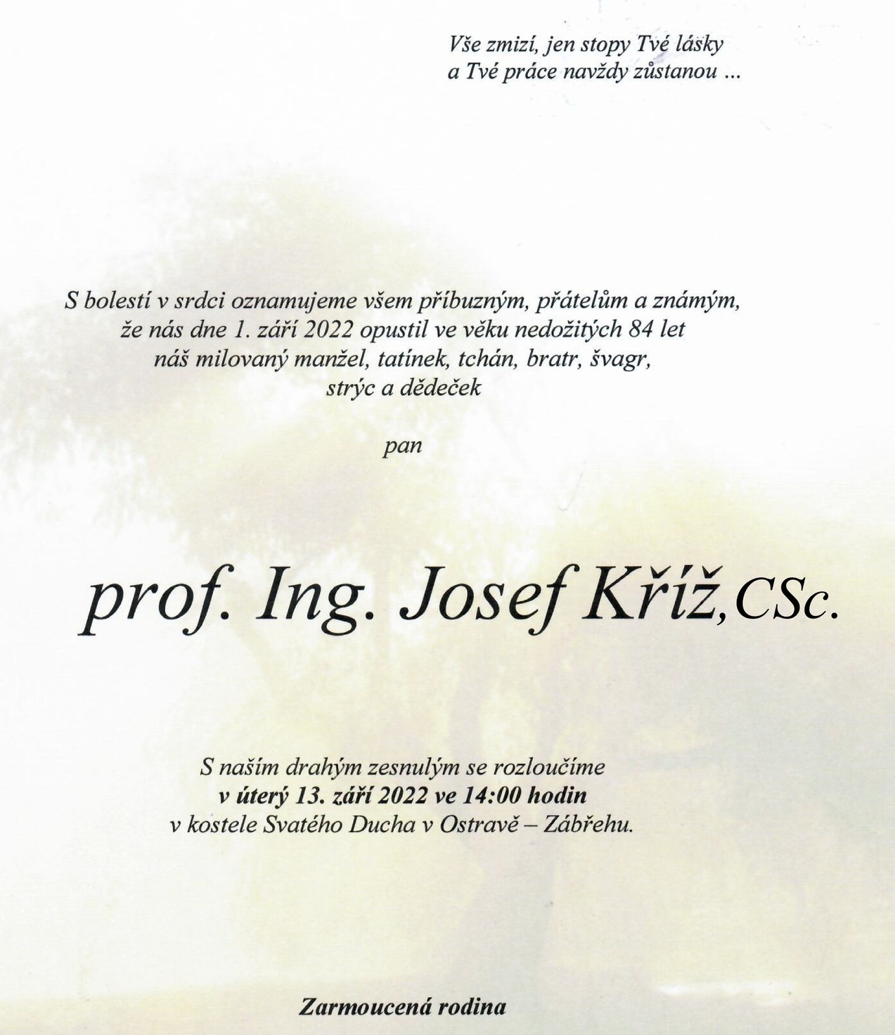 Dňa 1. septembra 2022 nás náhle opustil vo veku nedožitých 84 rokov prof. Ing. Josef Kříž, CSc., profesor emeritus. Pepa, ako sme mu všetci vravievali, započal svoju lásku k lietaniu už v Svazarme v Holíči, neskôr úspešne absolvoval ako stojný inžinier štúdium na Vojenské akadémii Antonína Zápotockého v Brne odbor letecké motory a od roku 1966 pôsobil ako odborný asistent, neskôr ako docent a profesor na Katedre leteckej dopravy Vysokej školy dopravnej v Žiline. Veľkou mierou sa zaslúžil o vybudovanie letiska Dolný Hričov, zabezpečenie lietadlového parku pre univerzitu ako aj vybudovanie prvého leteckého simulátoru JAK-40. Významnou mierou aj z pozície predsedu Akademického senátu FPEDAS sa pričinil o rozvoj fakulty, ale ako expert aj o jej informatizáciu a zavádzanie počítačových sietí. Spolu so svojimi kolegami v náročnom období po rozdelení Československa zreformovali dovtedy ponúkané študijné programy na Katedre leteckej dopravy tak, aby vyhovovali požiadavkám Európskej únie na bezpečnú, spoľahlivú a efektívnu leteckú dopravu, a aby študijné programy zároveň reflektovali celosvetové zmeny v leteckých technológiách. Spolupracoval aj s mnohými ďalšími univerzitnými pracoviskami, či už na dnešnej Žilinskej univerzity v Žiline, Strojníckej fakulte, ale aj s Vysokým učením technickým v Brne, Dopravnou fakultou Jana Pernera v Pardubiciach, či Technickou univerzitou v Košiciach, Leteckou fakultou. Lietanie nebola len jeho práca, ale aj koníček, ktorému sa venoval vo voľnom čase, bol členom trénerského kolektívu reprezentačného tímu republiky v presnom lietaní. Letectvo sa stalo jeho celoživotným poslaním, bol rád, že svojím pôsobením prispel k výchove leteckých odborníkov. Študentom vštepoval nie len teoretické znalosti, ale aj ako letecký inštruktor vychoval vynikajúcich pilotov, ktorí na neho ani po čase nezabudli stali sa jeho celoživotnými priateľmi. No nebol len výborný profesionál, ale hlavne človek, ktorý sa okrem svojej práce s veľkou láskou venoval svojej rodine- milovanej paň mámě Milene, dcére Katce a synovi Romanovi v ktorých sa videl, a keď prišli na návštevu vnúčatá, už ho na letisku neudržala ani jeho láska k lietaniu a každú voľnú chvíľu venoval hlavne im.
